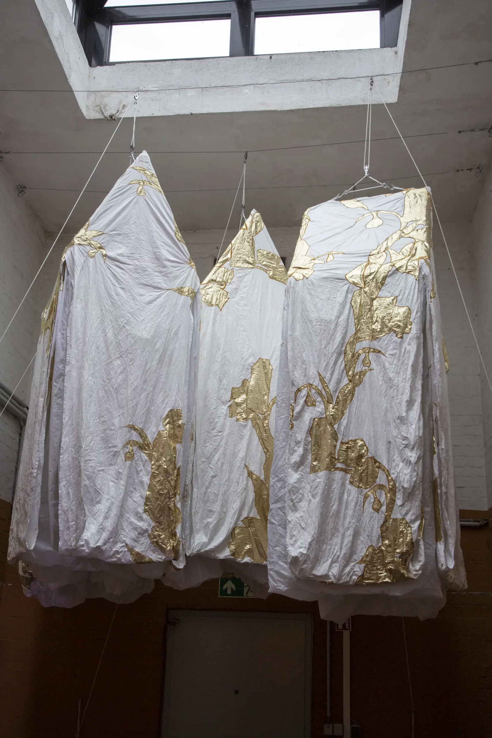 Bärenzwinger’s central space opens with the performative installation Shifts (Procession) (2019-ongoing) by Stephanie Imbeau. Five portable houses, designed as though for individual survival, defy our faith in sedentary life. The artist configures these habitat-envelopes through materials that are transportable, weatherproof and modulable. Hanging them in a theatrical way, from the ceiling, Stephanie Imbeau invites us to activate them, crossing their thresholds, which are made up of several layers of fabric. As they are set into movement, possible projections of a private space appear, both monumental and fragile. The installation Procession (Interiors, Winter) (2021-2022) is a village crossing, in which each envelope, infused with a dreamlike light, invites us to a moment of introspection and integration of our memories and our dreams. It transgresses the Bärenzwinger symbolism, creating temporary, desirable spaces that offer a hospitable shelter for thoughts and bodies.